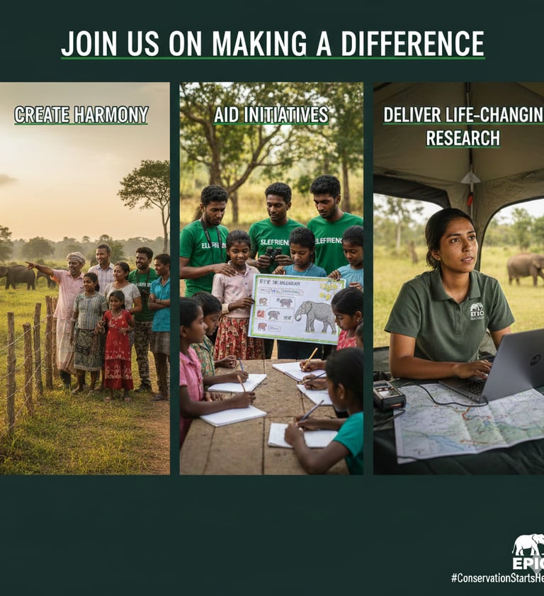 A major challenge in mitigating human-elephant conflict is the limited availability of long-term data on elephant movements, behavior, feeding patterns, and the human dimensions of conflict. This gap often exists due to limited facilities and support for international researchers in Sri Lanka. To address this, we offer supervised, collaborative opportunities for projects ranging from undergraduate to PhD level, as well as internships and volunteering to help develop future careers in conservation. These programs provide hands-on experience in elephant conservation while fostering global participation and collaboration